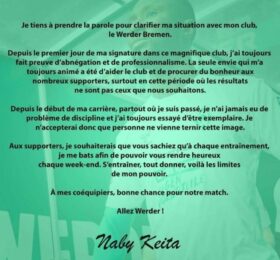 Werder : Naby Keita se défend après des accusations de subordination portées par son club