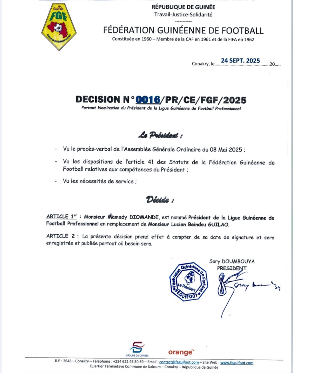 CONAKRY- La fédération Guinéenne de Football vient d’annoncer une décision prise ce mercredi 24 septembre. En effet, elle a décidé de limoger le président de la Ligue Guinéenne de Football Professionnel (LGFP). Sans aucune raison invoquée, la Féguifoot éjecte Lucien Beindou Guilao qui dirigeait cette instance ces dernières années.