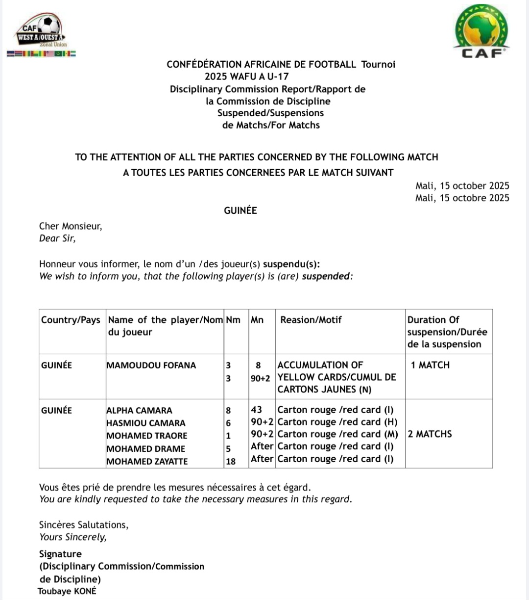 BAMAKO- Après les incidents qui sont suivis le match entre la Guinée U-17 et le Mali, en demi-finale du tournoi de Bamako. Ainsi, 6 joueurs du syli cadets ont été suspendus, voici la de décision de WAFU.