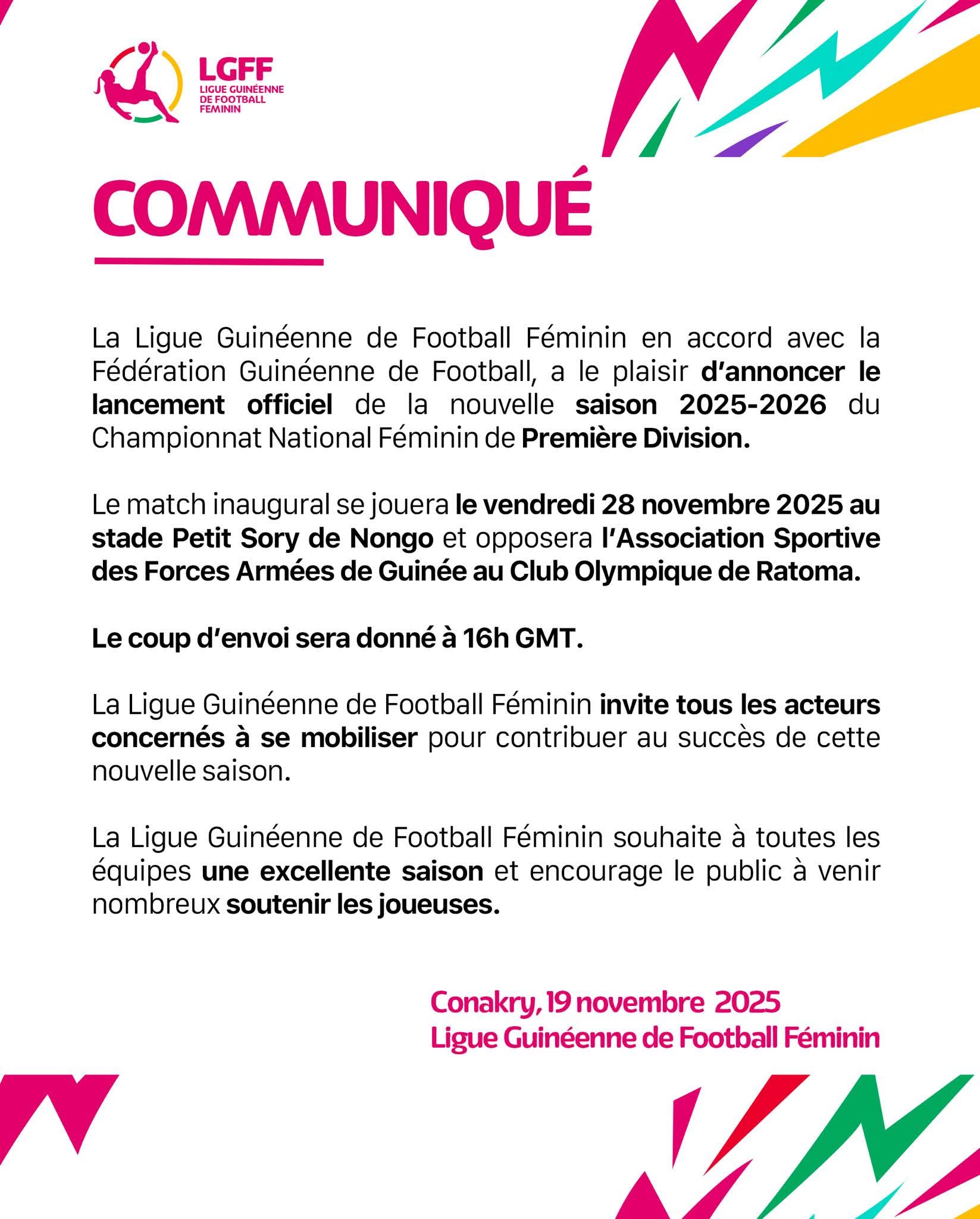 CONAKRY- C’est une bonne nouvelle pour le football féminin, souvent oublié par les autorités. Dans un communiqué, la Ligue Guinéenne de Football féminin annnce le démarrage du championnat national féminin pour le compte de la nouvelle saison. Le coup d’envoi sera donné le 28 novembre prochain au stade Petit Sory de Nongo, et c’est le club olympique de Ratoma et l’ASFAG qui ouvriront les débats lors du match d’ouverture.