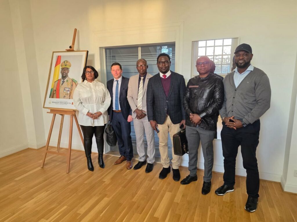 Sur instruction de son Excellence Monsieur l’Ambassadeur , M. Tino Lippmann, PDG de Limpex Dienstleistungen und Logistik, accompagné de son partenaire M. Alexandre Kem, a été reçu le 16 décembre 2025 par Dr Alhassane Cissé, Ministre conseiller, en présence du premier Conseiller chargé des affaires politiques ,de la première Conseillère chargée des affaires commerciales et industrielles et le chargé de la communication.