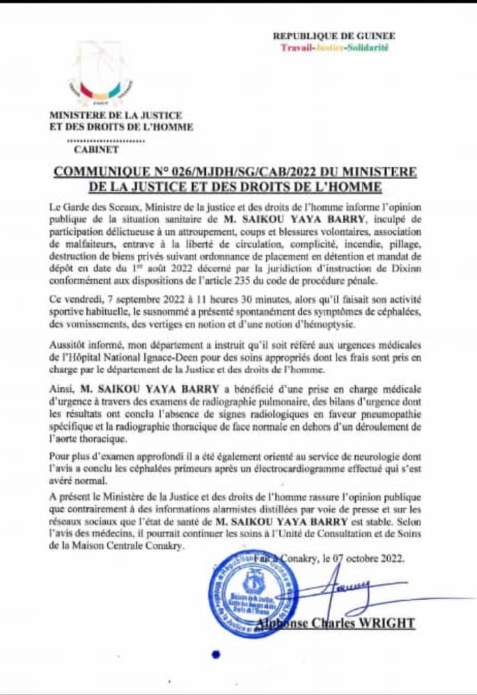 L’article Le ministère de la Justice annonce la stabilité de l’état de santé de Saikou Yaya Barry est apparu en premier sur Guinee7.com.