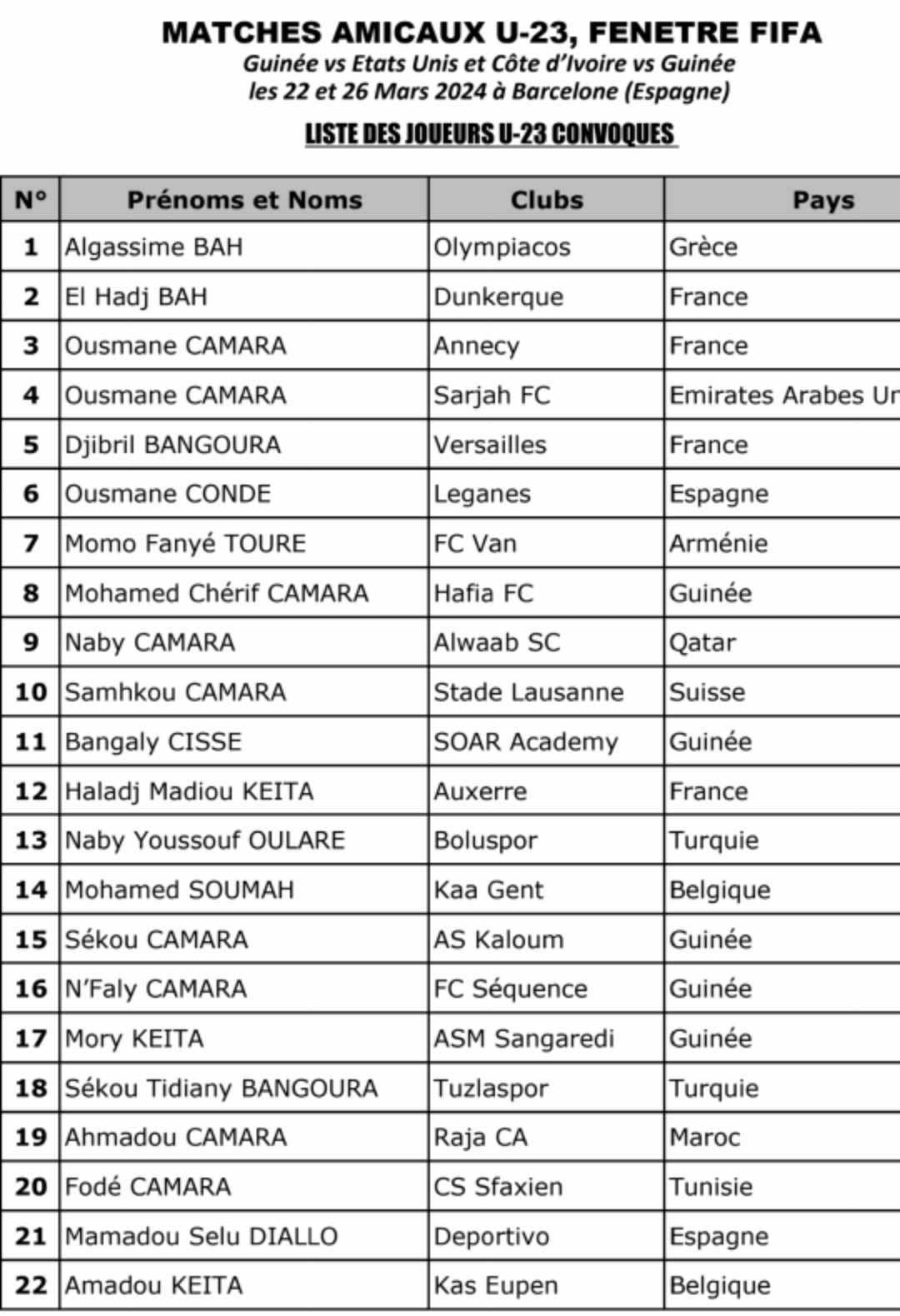 CONAKRY- La sélection Guinéenne des moins de 23 ans négociera deux matches amicaux contre les États-Unis d’Amérique le 22 mars et la Côte d’Ivoire le 26 mars à Barcelone en Espagne.