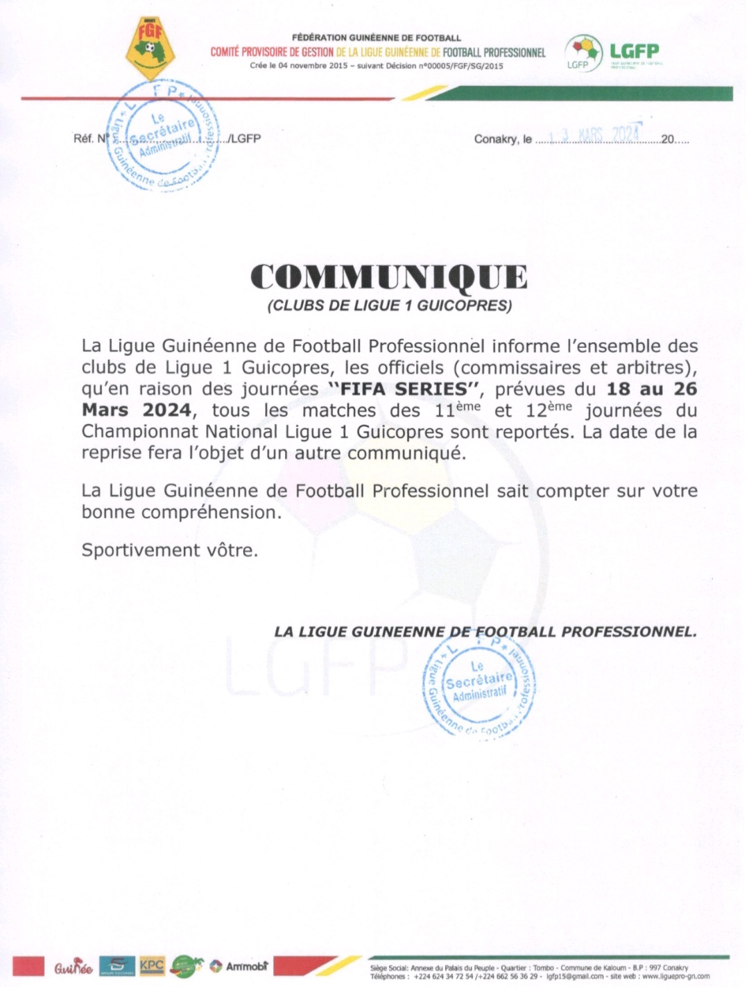 CONAKRY- A travers un communiqué publié ce mercredi, la Ligue Guinéenne de Football Professionnel (LGFP) a annoncé l’arrêt momentané du championnat guinéen de Ligue 1 de football.