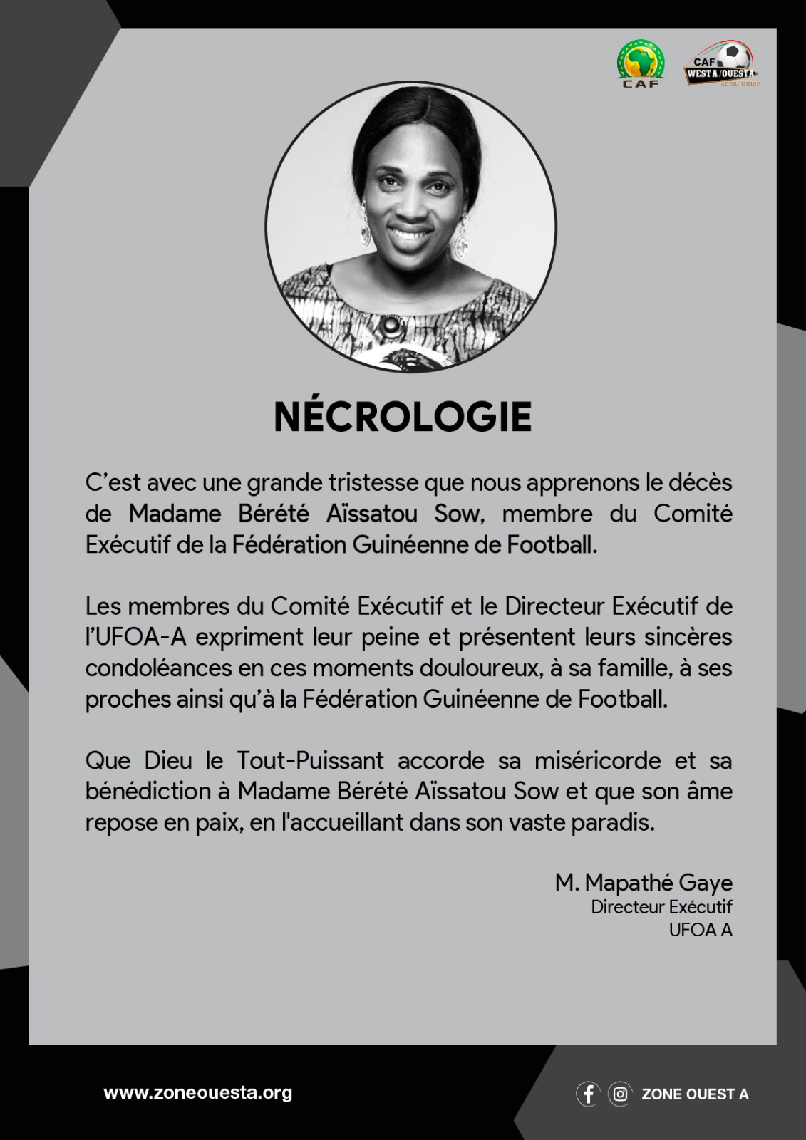 Le Directeur Exécutif de l’UFOA-A ainsi que les membres de cette association ouest-africaine de football disent exprimer « leur peine et présentent leurs sincères condoléances à la famille de feue Aïssatou Sow, à ses proches ainsi qu’à la fédération Guinéenne de Football, en ces moments douloureux ».