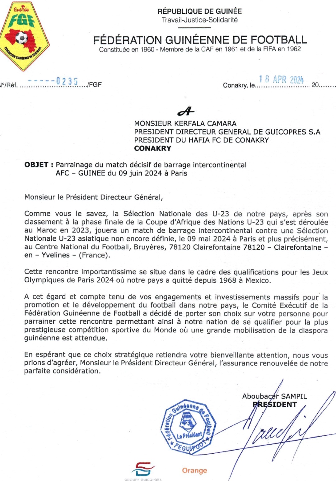 Pour y arriver, l’équipe dirigée par le Président Aboubacar Sampil veut non seulement mobiliser la diaspora guinéenne d’Europe, mais aussi les personnalités sportives du pays. C’est le cas du Président du Hafia FC Kerfalla Camara KPC, approché pour être parrain de ce match du 9 mai prochain à Paris entre le Syli U-23 et une sélection Asiatique. « Compte-tenu de vos engagements et investissements massifs pour la promotion et le développement du football dans notre pays, le COMEX de la Féguifoot a décidé de porter son choix sur votre personne pour parrainer cette rencontre permettant ainsi à notre nation de se qualifier pour la plus prestigieuse compétition sportive du monde oû une grande mobilisation de la diaspora guinéenne est attendue » précise la Féguifoot, dans ce courrier ci-dessous.