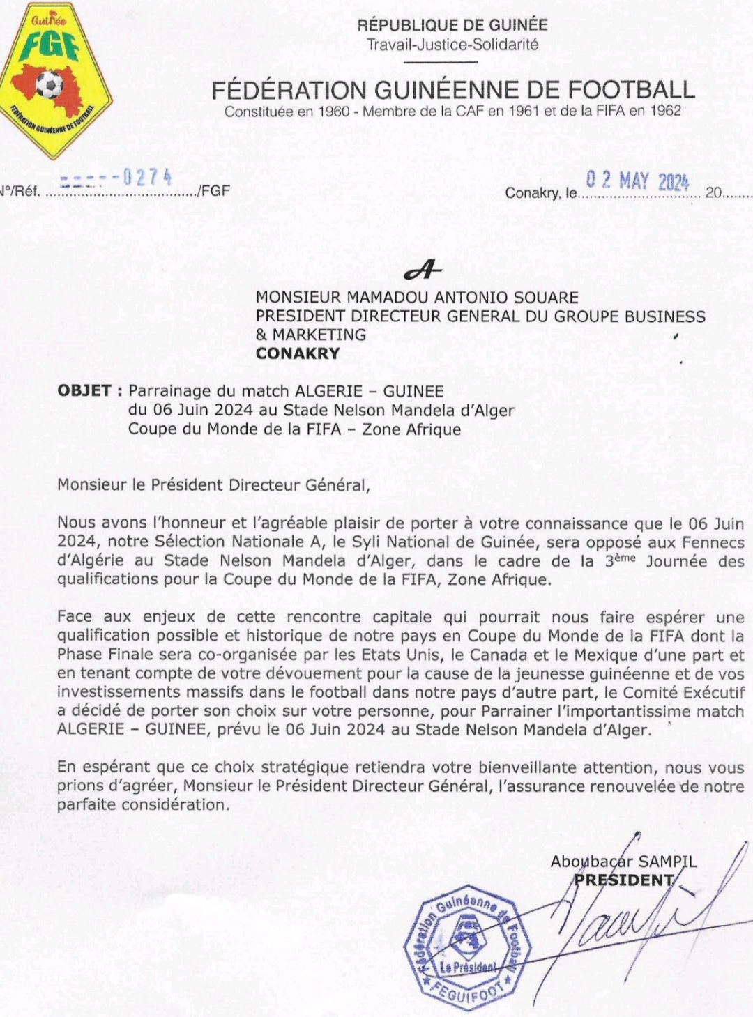 Et ce match, la fédération Guinéenne de Football a choisi Antonio Souaré pour le parrainer. A travers cette démarche participative, le Président Aboubacar Dinah Sampil et son comité exécutif se sont fixés un objectif : celui de rassembler tous les grands mécènes du pays autour de Syli National de Guinée. Récemment, l’équipe élue à la tête de la fédération avait effectué le déplacement pour aller échanger et prendre contact avec le PDG du groupe SAM GBM, propriétaire du Horoya AC de Guinée. Une démarche inclusive appréciée par des observateurs qui estiment que le football guinéen progressera avec tous ses acteurs et à tous les niveaux.