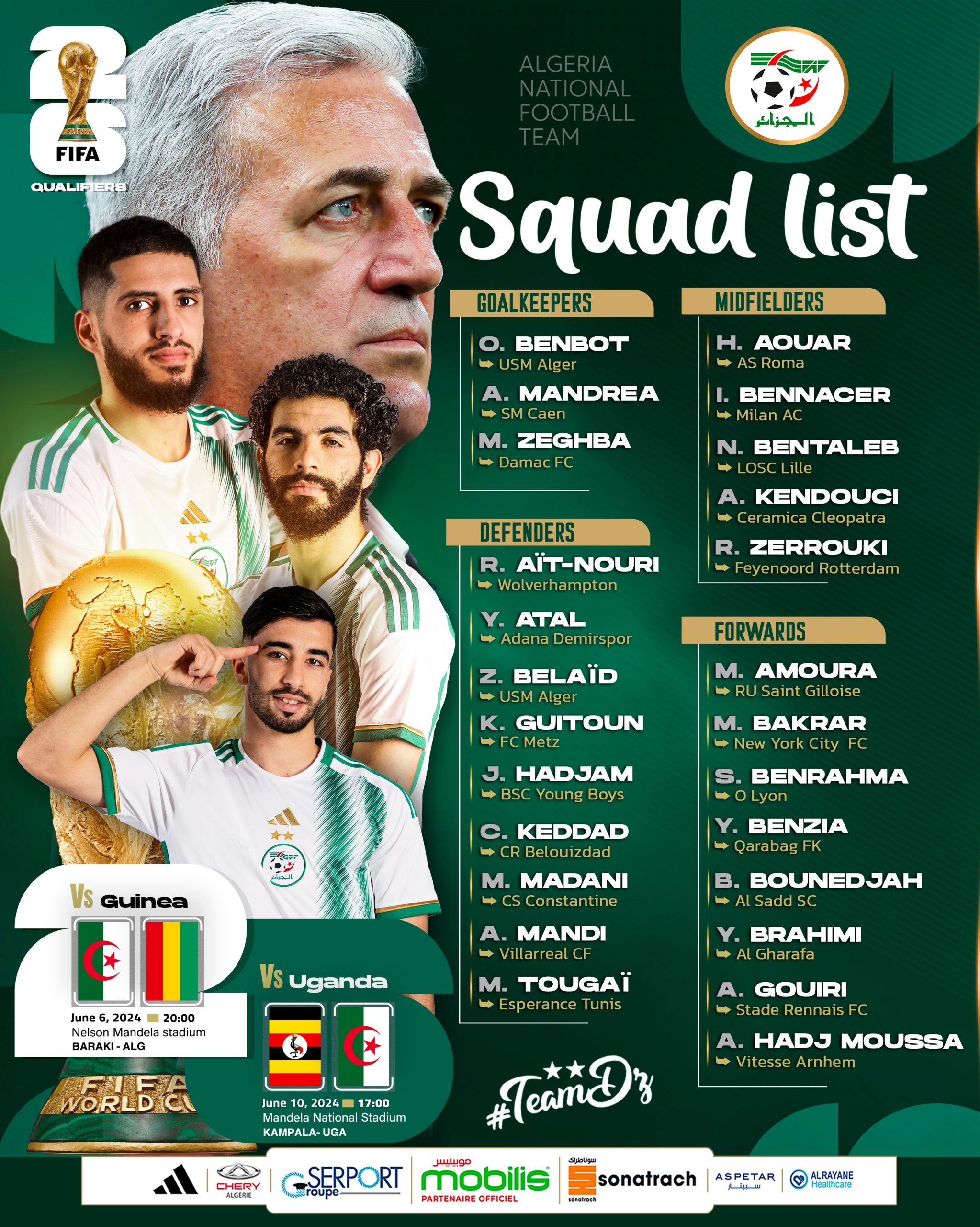 Les Verts disputeront rappelons le, deux matchs pour le compte du groupe (G) des éliminatoires de la Coupe du Monde de la FIFA 2026 face à la Guinée, le 06 juin 2024 au stade Nelson Mandela de Baraki (20h) et l’Ouganda, le 10 du même mois au Mandela National Stadium de Kampala (17h). On note les absents comme Youcef Belaili, Sofiane Feghouli, Islam Slimani et Riyad Mahrez.