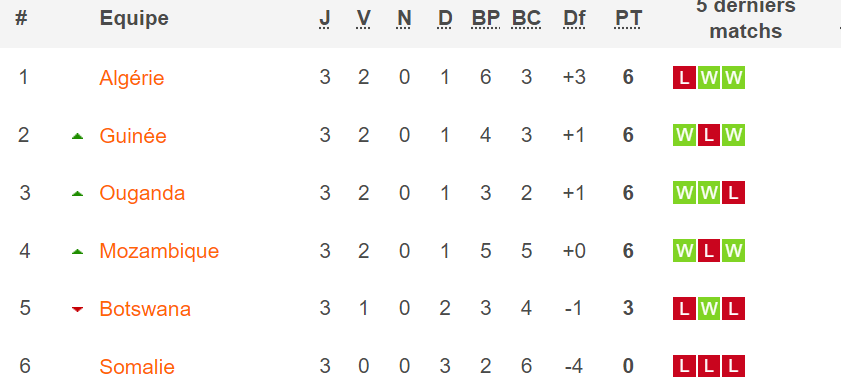 Ce groupe reste serré avec 4 équipes à 6 points, une équipe à 3 points et la Somalie qui occupe la dernière place avec 0 points. A vu de la configuration de groupe, le goal différentiel sera un élément essentiel pour la course à la 1ère place. Pour le moment, l’Algérie est devant avec + 3 en solde sur les buts.