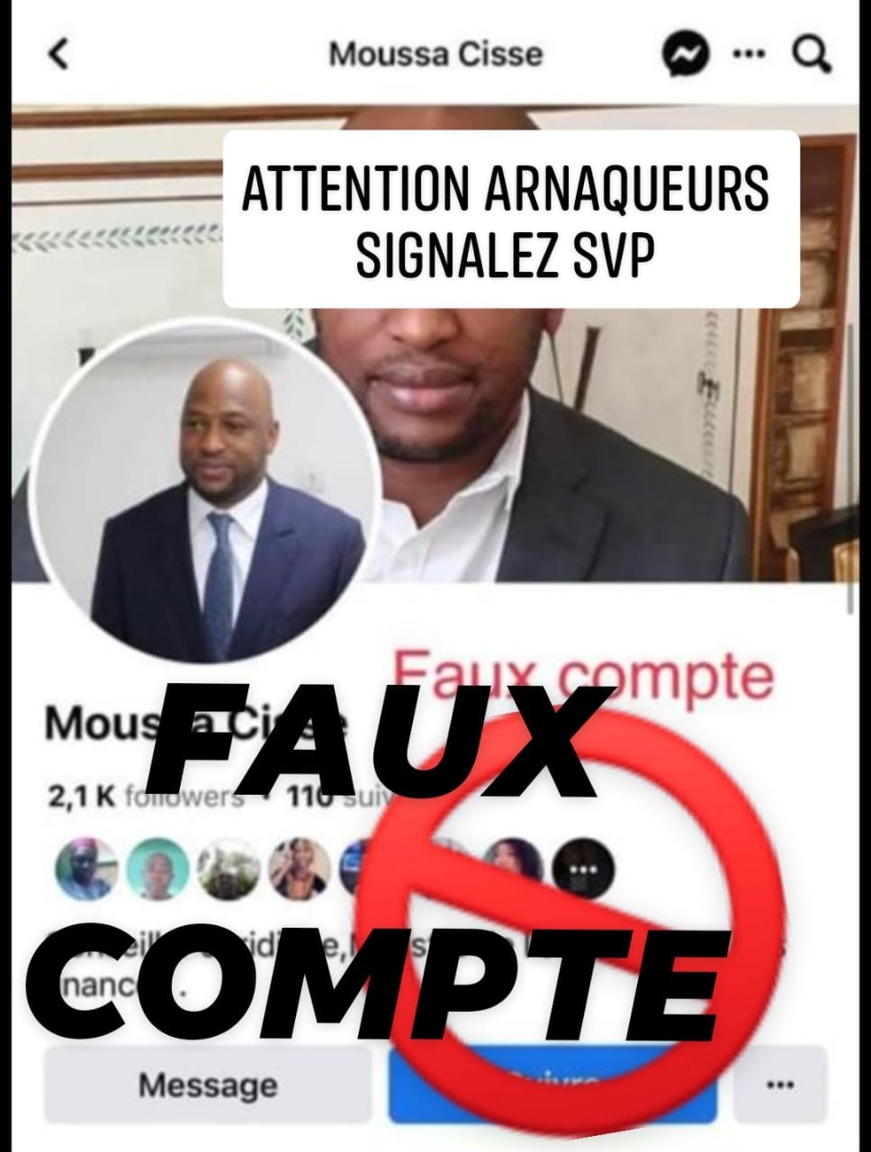 L’alerte est donnée par M. Moussa CISSE lui-même, ancien ministre et ancien Directeur Général de la SONAP en ces termes « Merci de faire attention chers amis, frères, collaborateurs et connaissances « je suis alerté que des comptes à mon nom envoient des invitations tous azimuts. Ce sont des faux comptes ».