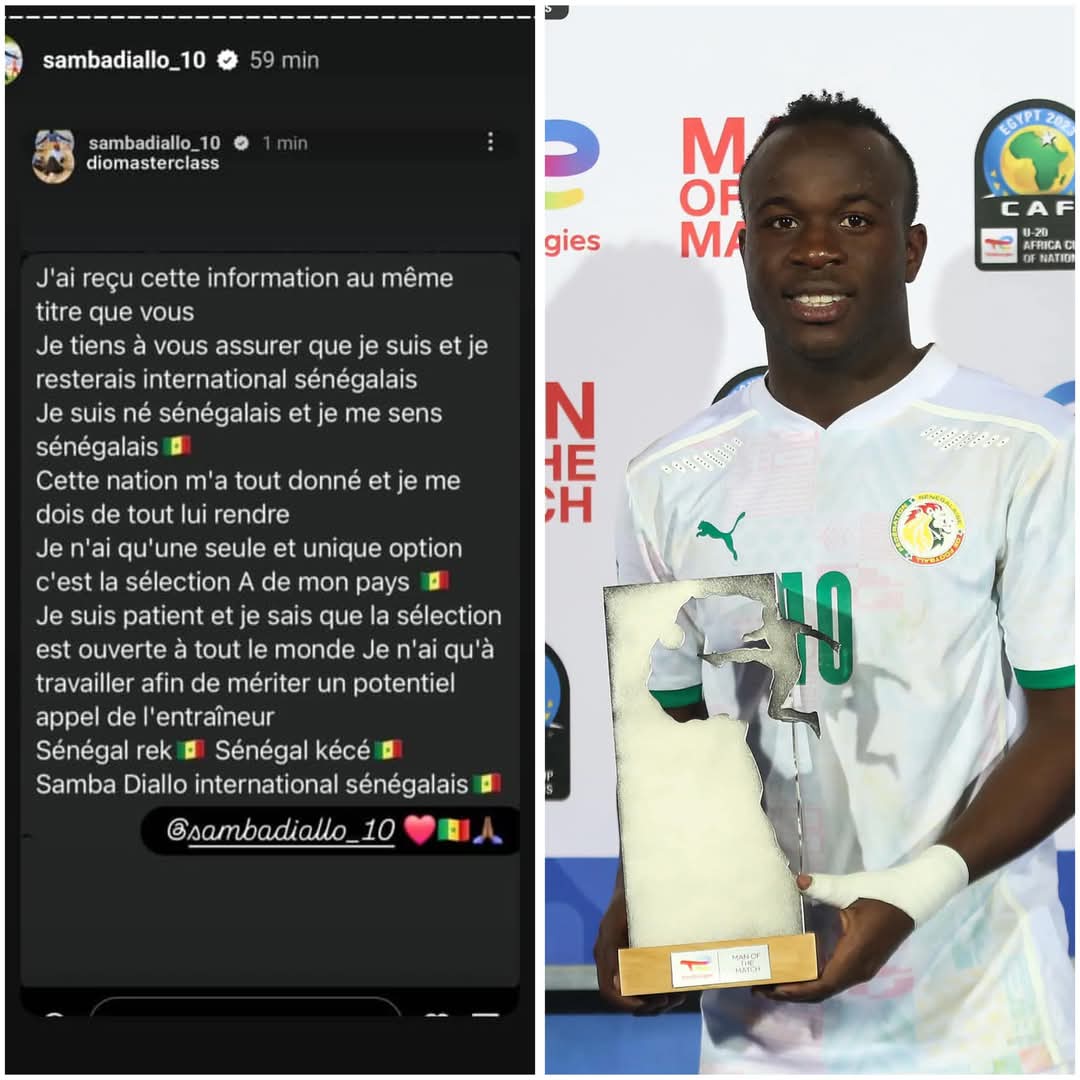 CONAKRY- Alors que le média sénégalais Dsports.net annonçait que le joueur sénégalais Samba Diallo aurait décidé de jouer pour la Guinée, l’intéressé vient de démentir l’information. Sur son compte instagram, Samba Diallo réitère et rapelle son choix de défendre les couleurs du Sénégal, et donc, pas celles du Syli National de Guinée.