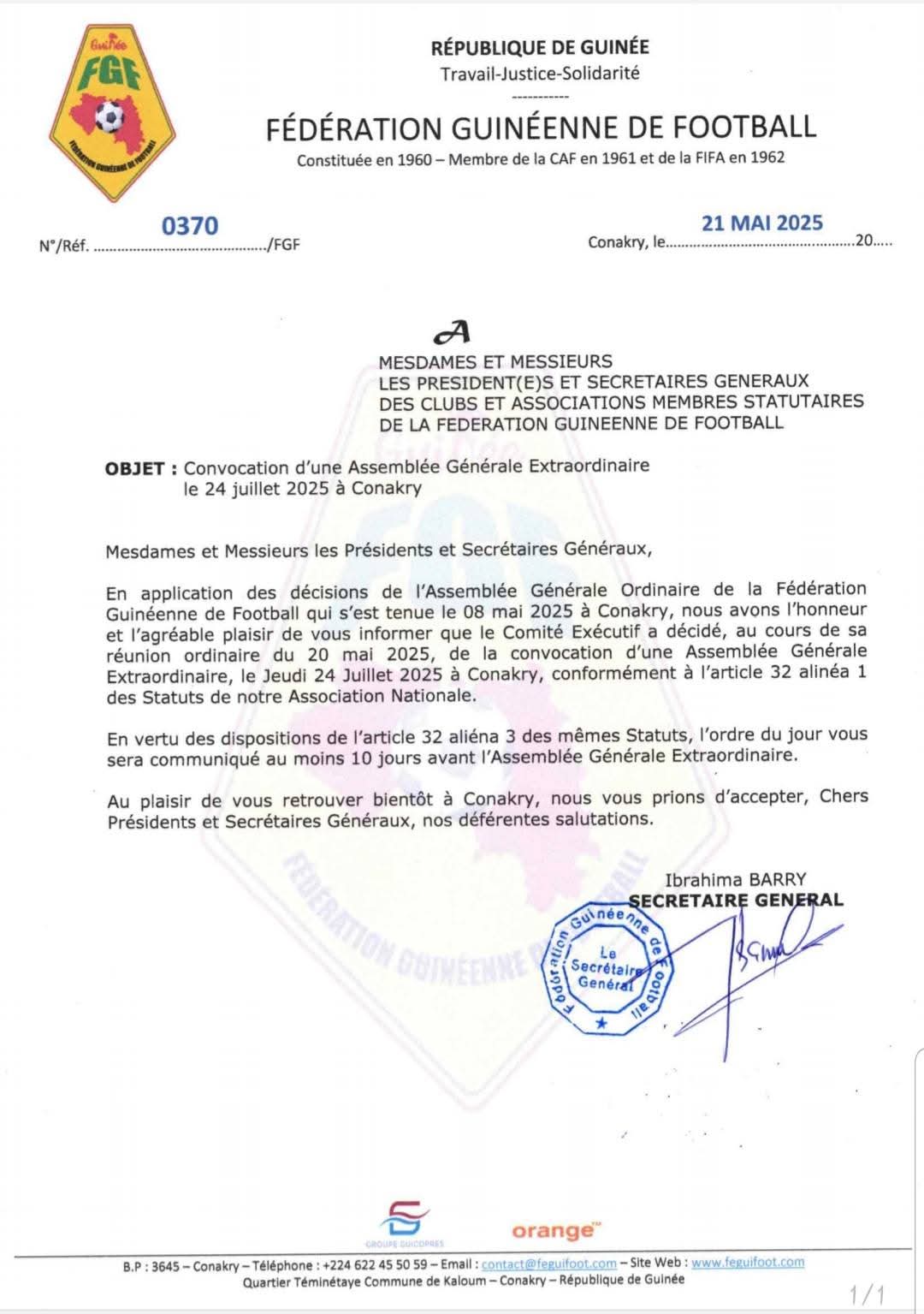 CONAKRY- Le comité exécutif de la Fédération Guinéenne de Football piloté par Sorel Doumbouya, était en réunion ce mardi 20 mai à Conakry, au siège de la Féguifoot. A l’issue de ce conclave, il a été décidé de convoquer l’Assemblée Générale Extraordinaire, après l’Assemblée ordinaire qui a récemment voté la révocation définitive de Bouba Sampil.